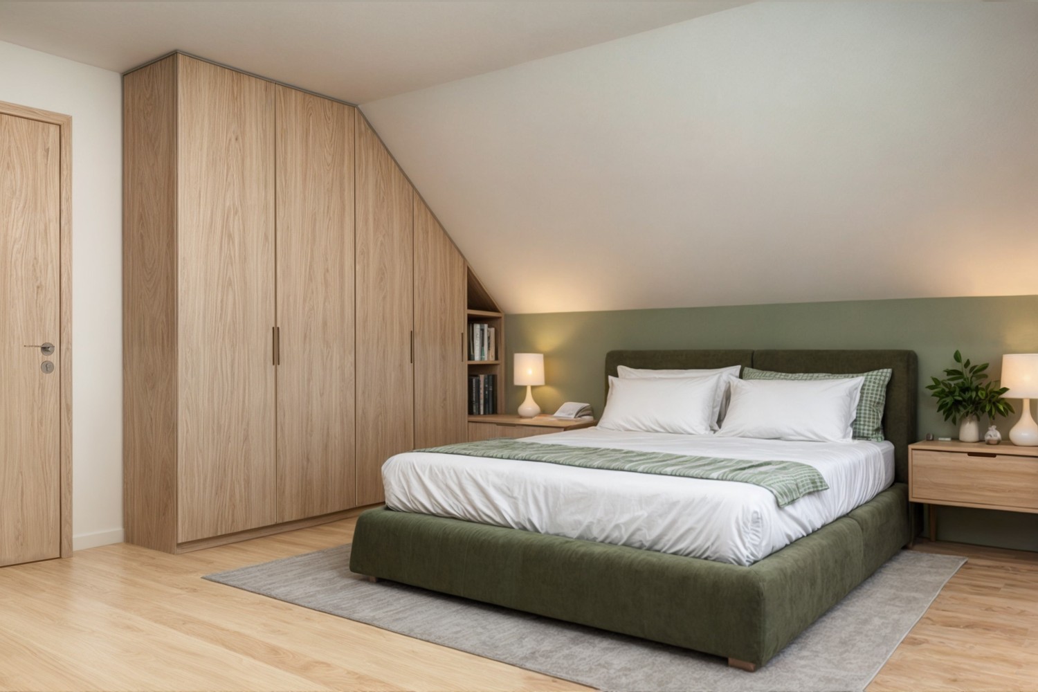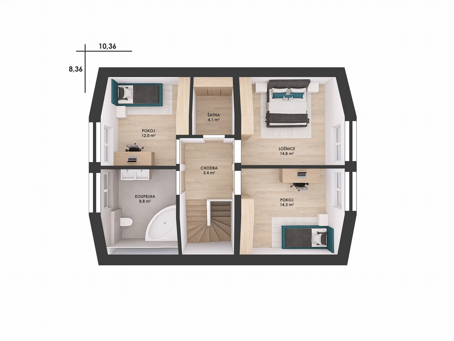 Podkroví pak poskytuje plnohodnotné soukromí pro rodinu: dvě prostorné ložnice (14,8 a 14,3 m²), další pokoj (12,0 m²), koupelnu, šatnu a centrální chodbu se schodištěm. Dispozice je symetrická, přehledná a umožňuje snadné rozdělení na denní a noční zónu.