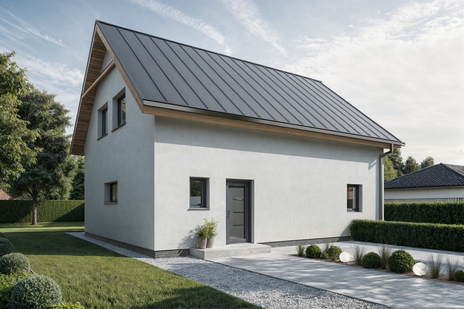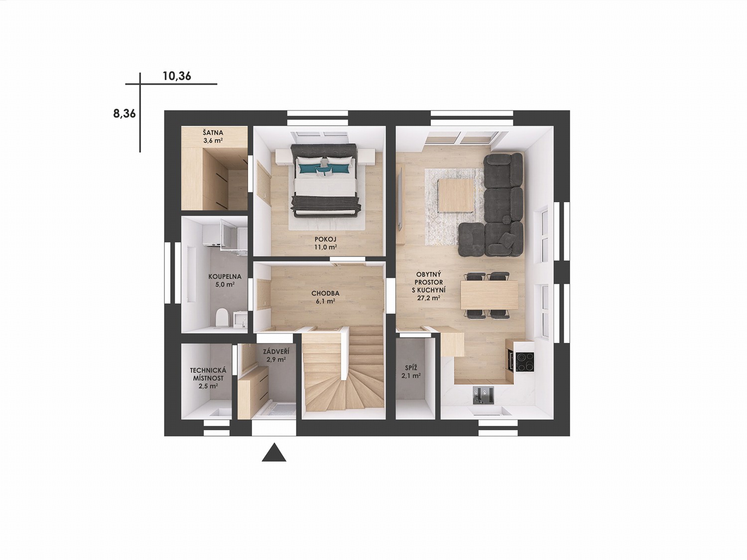 Tento moderní dům s obytným podkrovím je ideální volbou pro menší pozemky, kde je potřeba skloubit komfortní bydlení s efektivní dispozicí. Na zastavěné ploše 10,36 × 8,36 m nabízí přízemí vzdušný obytný prostor s kuchyní (27,2 m²), pokoj, šatnu, koupelnu, technickou místnost, spíž a zádveří – vše navrženo tak, aby každý metr sloužil prakticky.