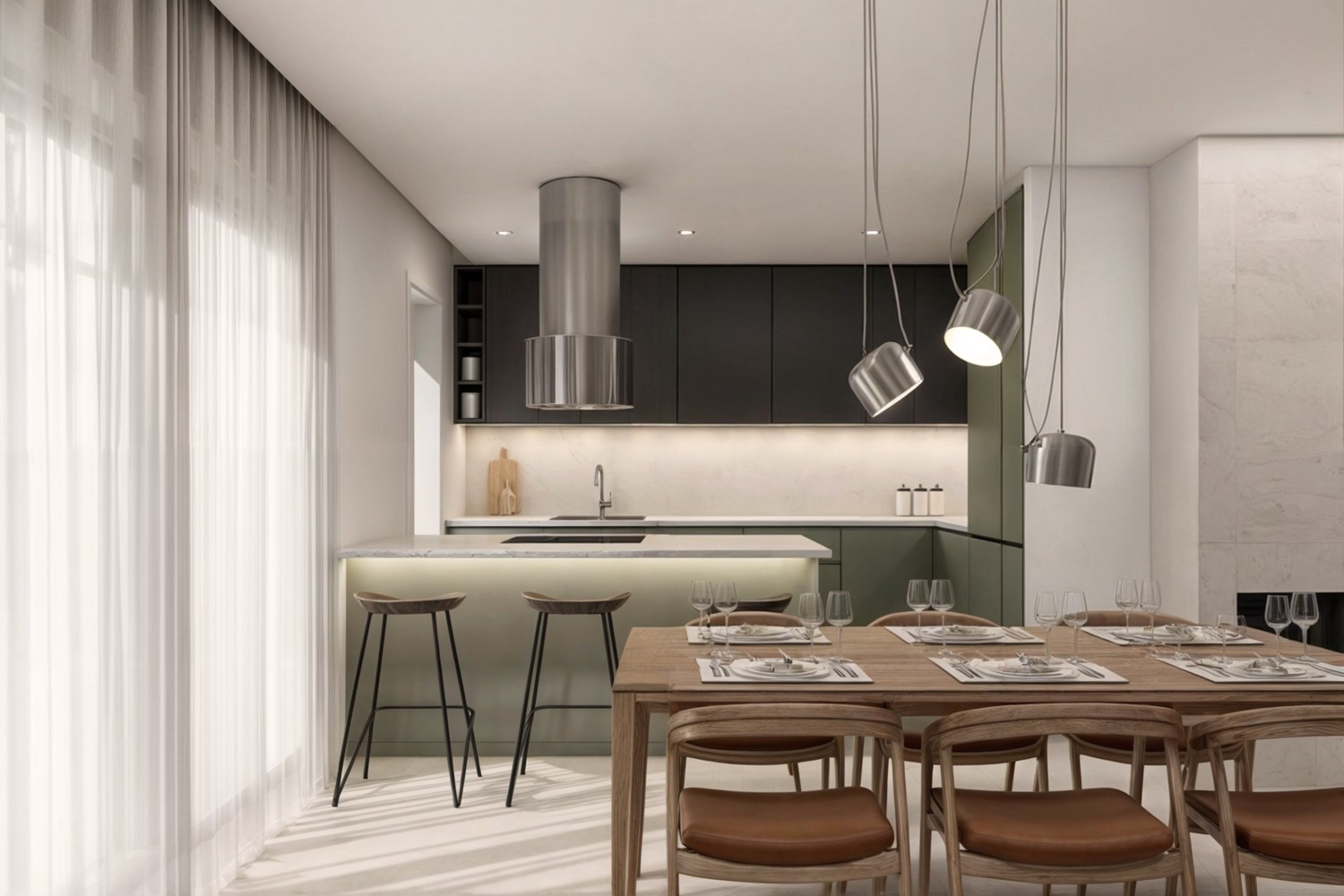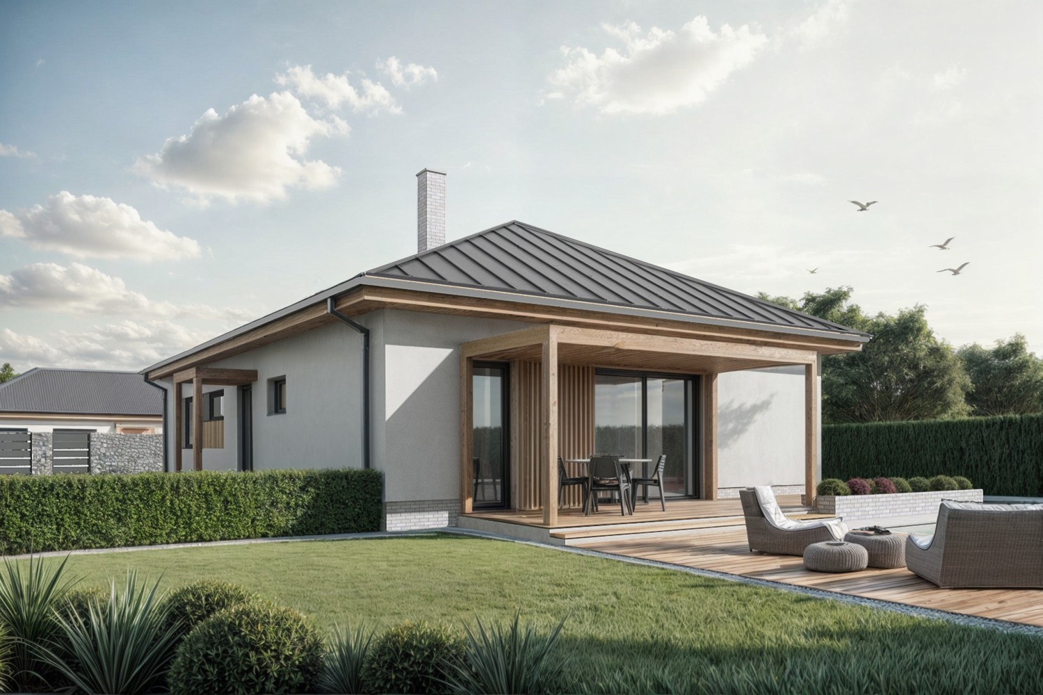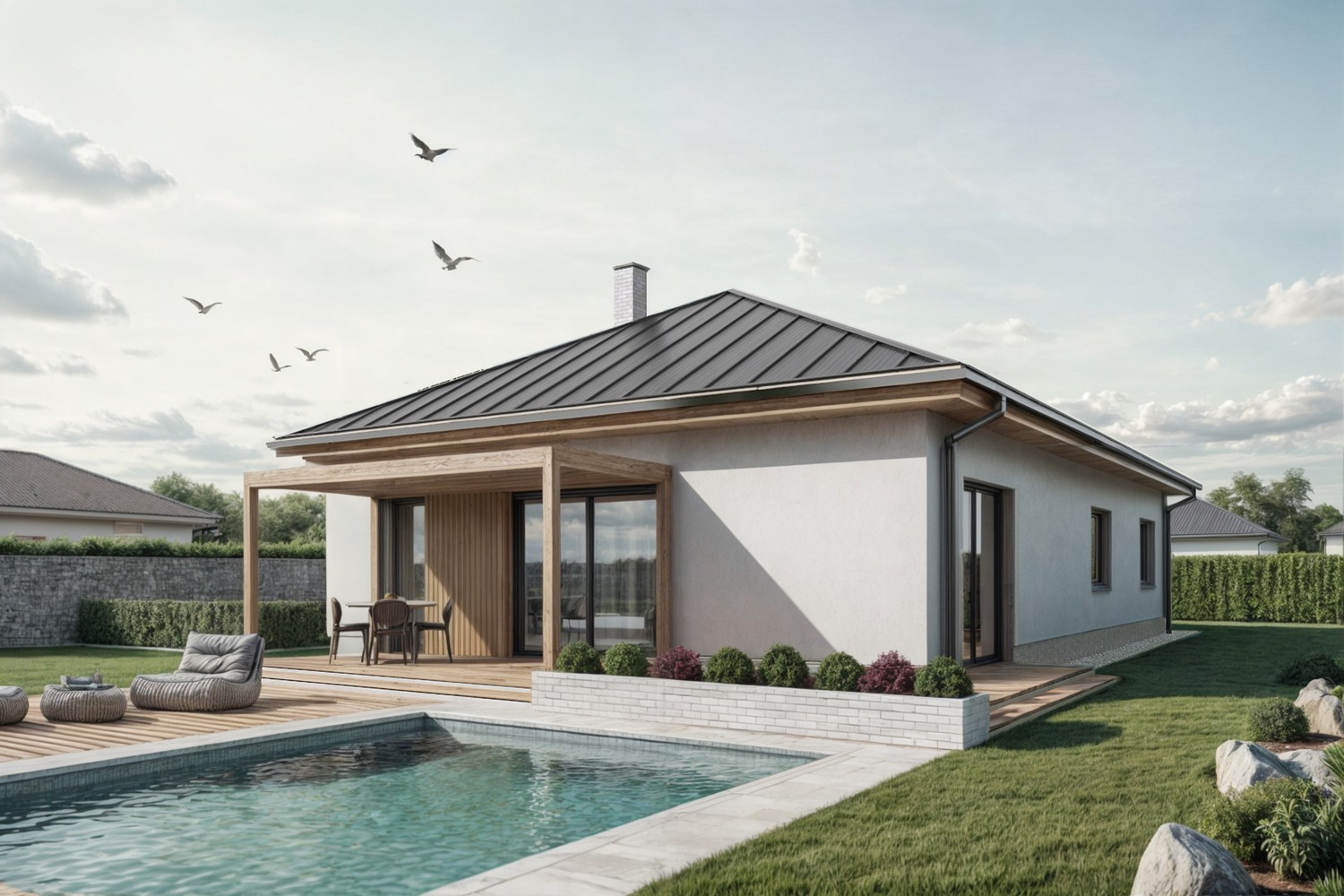 Tento elegantní jednopodlažní dům je navržen pro klienty, kteří hledají spojení moderní architektury, pohodlí a kvalitního venkovního života. Dispozice domu je kompaktní, ale funkčně bohatá – ideální pro páry, menší rodiny nebo jako rekreační sídlo.Dominantou je obytný prostor s kuchyní, který se díky velkým posuvným dveřím přirozeně propojuje s venkovní terasou. Ta nabízí zastřešené posezení, jídelní kout i relaxační zónu s výhledem na bazén. Dům je obklopen pečlivě upravenou zahradou, která zajišťuje soukromí i estetiku.