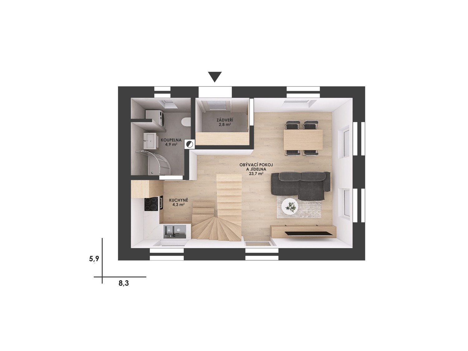 Tento moderní dvoupodlažní dům o kompaktním půdorysu 8,3 × 5,9 m nabízí překvapivě velkorysé bydlení díky chytrému rozvržení prostoru. Přízemí tvoří otevřený obytný prostor s kuchyní (23,7 m²), koupelna, zádveří a kuchyňský kout se spíží – ideální pro každodenní provoz i víkendové vaření. Centrální schodiště propojuje obě podlaží bez rušivých průchodů.Zastavěná plocha: 50m2